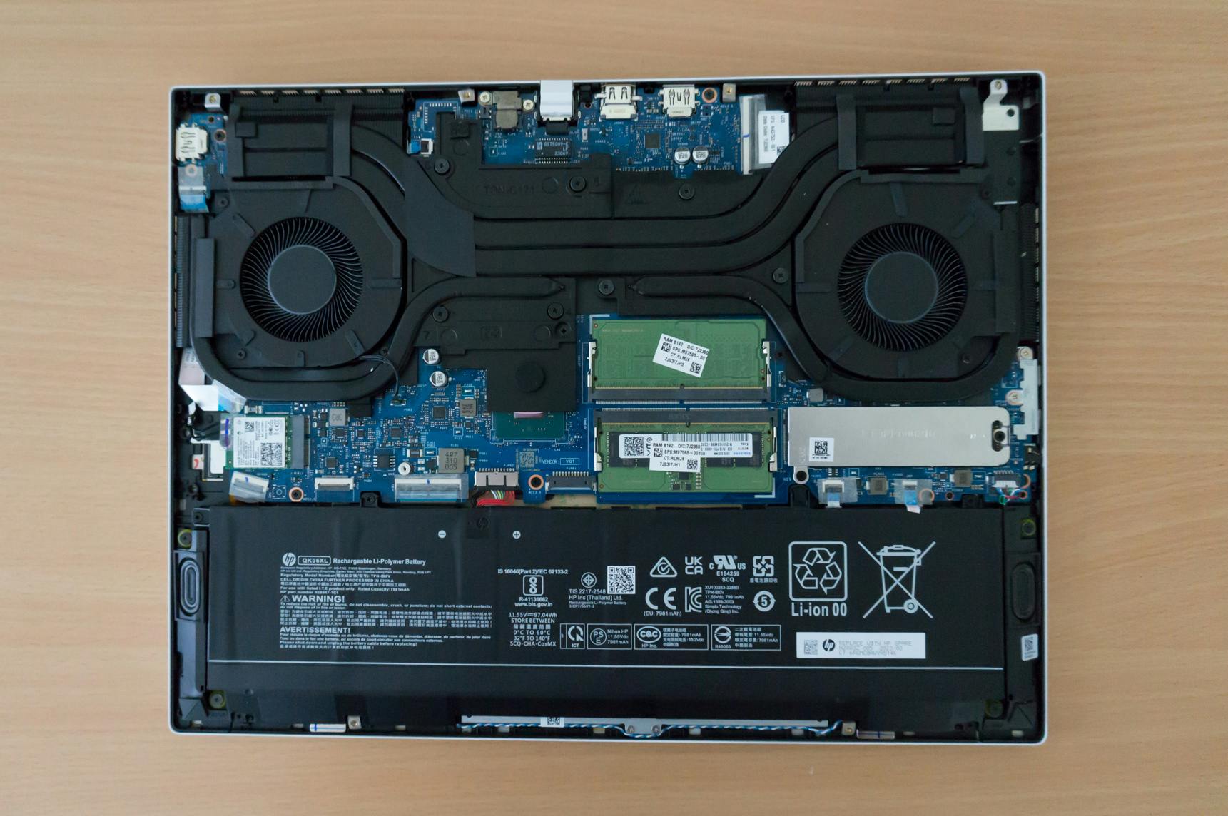 Hoewel de HP Omen Transcend 16 voor een gaminglaptop een dun ontwerp heeft, kun je gelukkig gewoon ouderwets upgraden. Je hoeft slechts vijf schroefjes te verwijderen om de onderkant los te klikken. Dat losklikken gaat overigens wel wat stroef; je hebt echt een plastic hulpmiddeltje nodig om de onderkant los te peuteren. Je kunt na het verwijderen van de onderkant het werkgeheugen en de M.2-ssd upgraden. Ook het steeds vaker vast gesoldeerde wifi-kaartje is uitgevoerd in M.2-formaat. Er is helaas niet voorzien in een tweede M.2-slot voor een ssd.