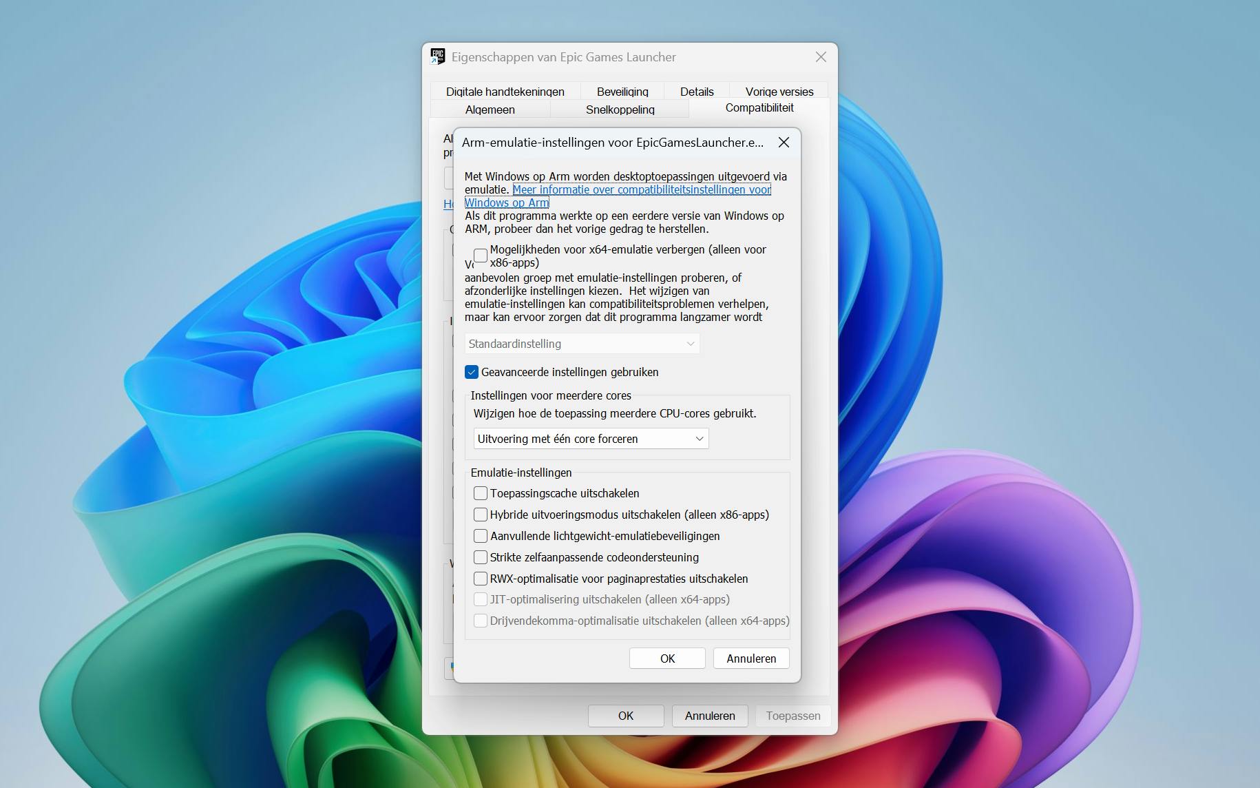 Veel software – waaronder alles van Microsoft, maar ook populaire programma's als Photoshop, Lightroom en Google Chrome – zijn er in een ARM-variant. Uiteraard is lang niet alles er in een ARM-verise en de Snapdragon X Elite kan de 'normale' x86-64-programma's niet direct uitvoeren. Toch zullen veel programma's gewoon werken dankzij Microsofts emulatielaag Prism. Ten opzichte van ARM-software lever je met emulatie wel zo'n 20 procent aan prestaties in, maar de processor is snel genoeg waardoor dat voor de meeste programma's niet heel veel uitmaakt. Helaas werkt niet alle software goed via PRISM. Start een programma niet, dan kun je via de compatibiliteitsinstellingen eventueel nog instellingen aanpassen. Zo wilde de Epic Games Launcher pas starten nadat we ervoor kozen om het programma op één core uit te voeren. Dat is natuurlijk niet optimaal, maar voor dit programma niet heel erg. Op het moment van schrijven is er ook populaire software als Adobe InDesign, Illustrator en Premiere Pro die helemaal niet functioneert; daar wordt wel aan gewerkt. Andere opvallende software die niet werkt is Google Drive voor desktop dat Google Drive in Verkenner integreert; Google zegt daar bovendien geen plannen voor te hebben.