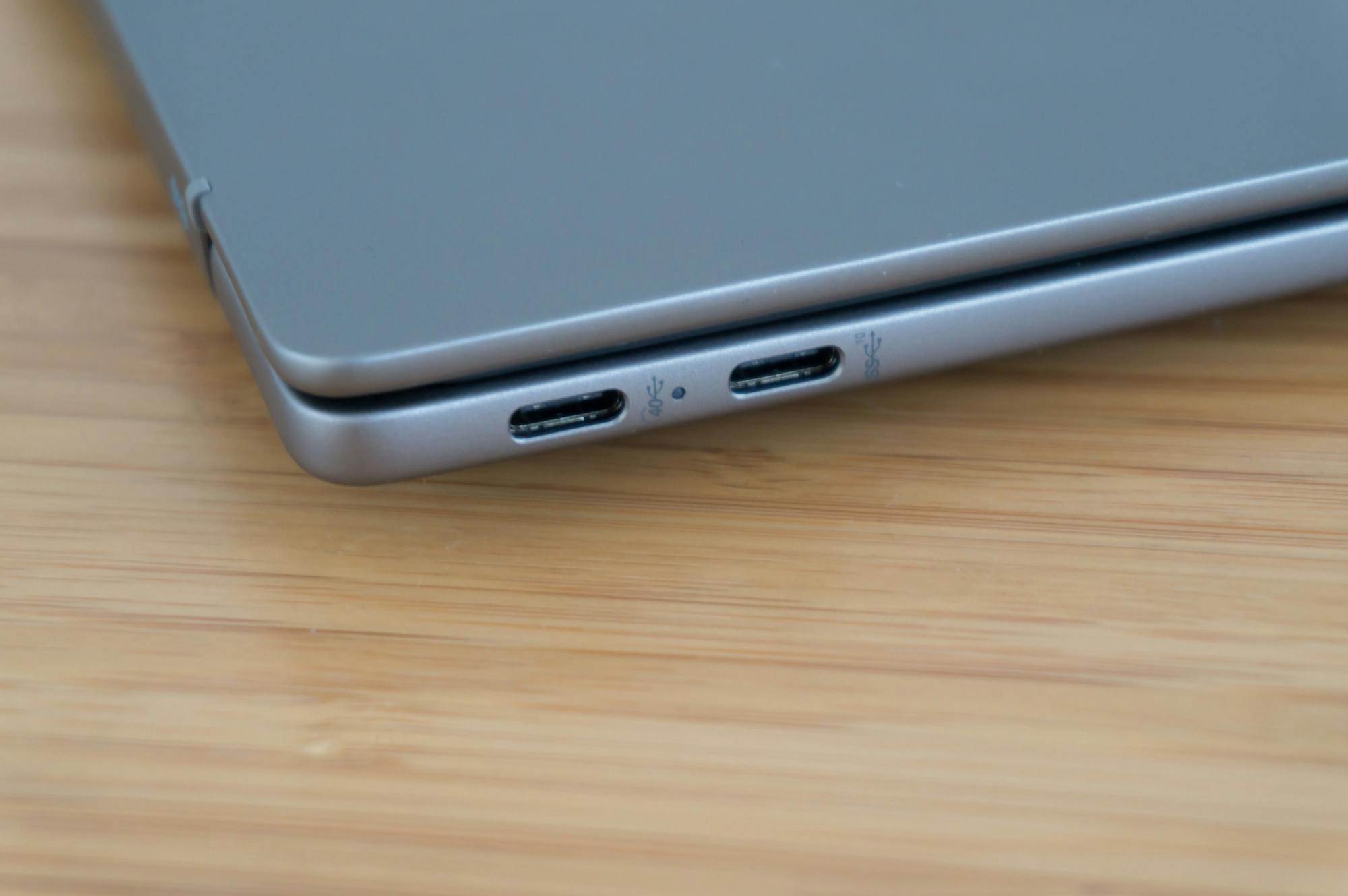 Je krijgt met tweemaal usb-c, usb en een headsetaansluiting niet heel veel aansluitingen, maar dat is door de universele usb-c-poort een steeds minder groot probleem. De twee usb-c-poorten zijn namelijk allebei geschikt voor data, opladen en het aansluiten van een beeldscherm. Wel is er een snelheidsverschil met respectievelijk een maximumsnelheid van 10 en 40 Gbit/s.