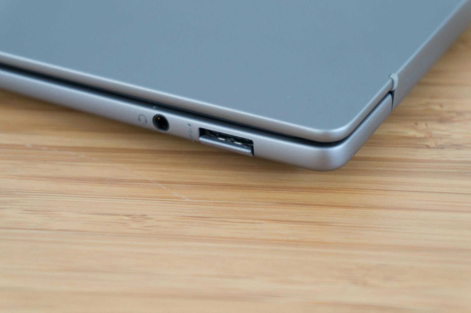 Aan de andere kant zien we een usb-a-poort met een maximale snelheid van 10 Gbit/s. Die is vanwege de geringe dikte van de laptop uitgevoerd met een klepje dat je omlaag moet duwen. Aanvankelijk waren we sceptisch, maar het klepje blijkt bijzonder handig te zijn ontworpen. Je kunt met de usb-stekker een randje naar beneden duwen waarna je de stekker direct in de usb-poort steekt.