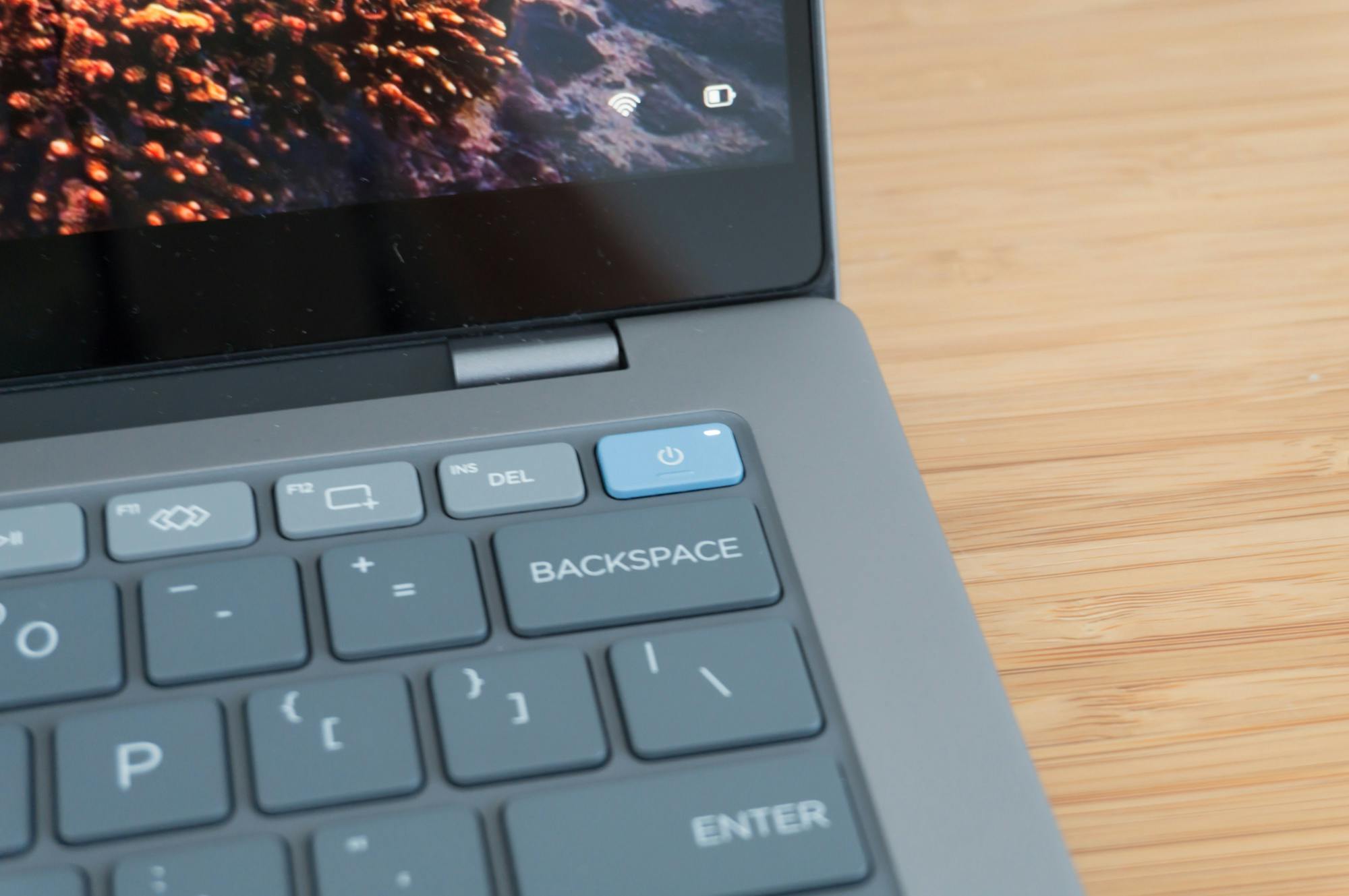 Het donkergrijze gedeelte van de behuizing met daarin het grotendeels grijze toetsenbord is een naadloos onderdeel van de behuizing. De functietoetsen zijn lichtgrijs, terwijl de aan-uit-toets blauw is. Het zorgt voor een overzichtelijk geheel, zeker in combinatie met de grote letter die op de toetsen wordt gebruikt. Afhankelijk van je typestijl zou het enige minpuntje kunnen zijn dat er geen rechter ctrl-toets is. Dat komt doordat HP aan de rechterkant een Copilot-toets heeft geplaatst die Microsofts virtuele assistent opent en relatief grote cursortoetsen gebruikt.