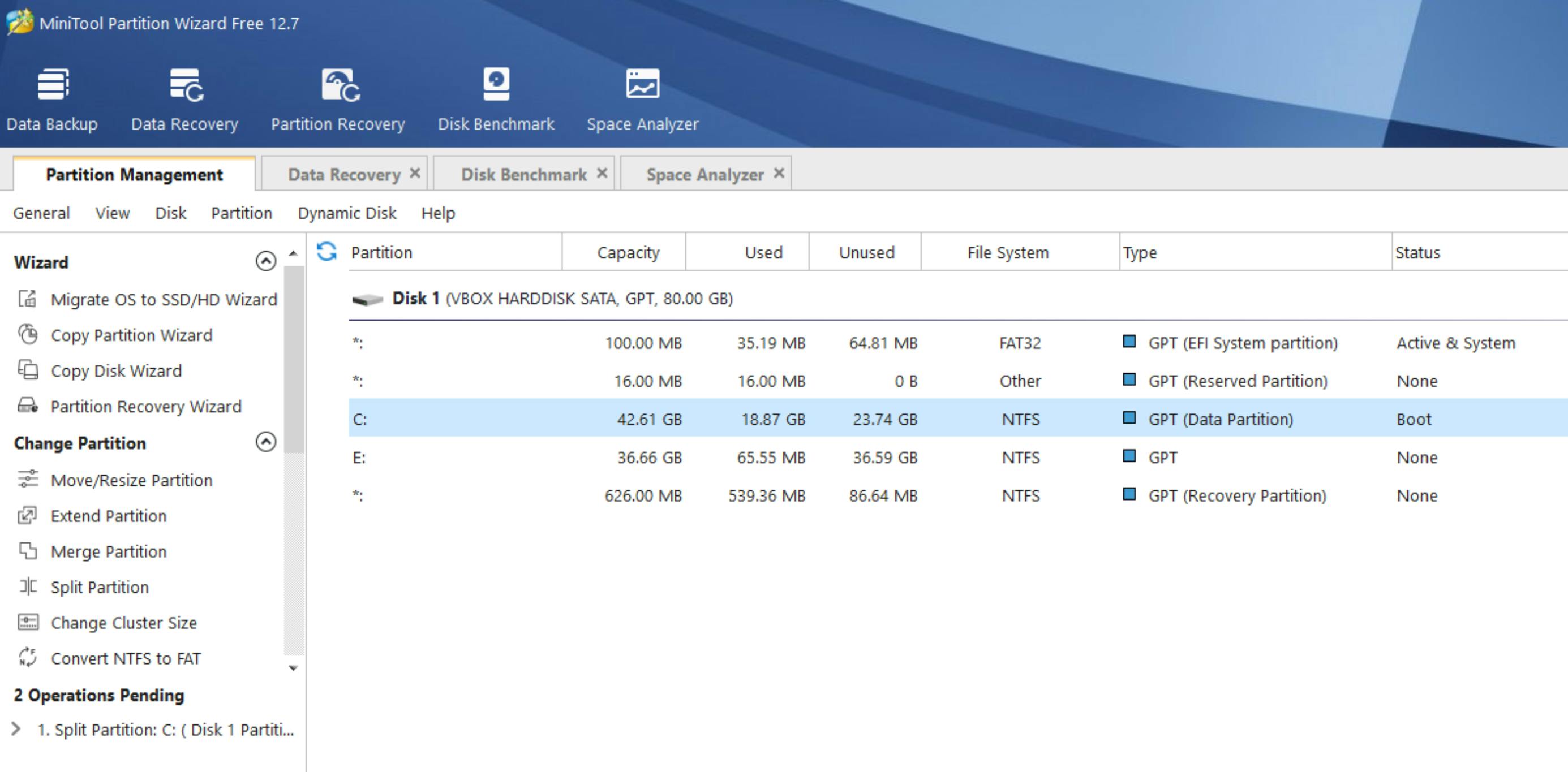 Op het tabblad Partition Management vind je de belangrijkste functies. Links in het venster zijn de opties ondergebracht, terwijl je rechts een overzicht van de volumes aantreft. Vooral de opties in de sectie Change Partition (links in het venster) zijn interessant voor het ordenen van de schijf.