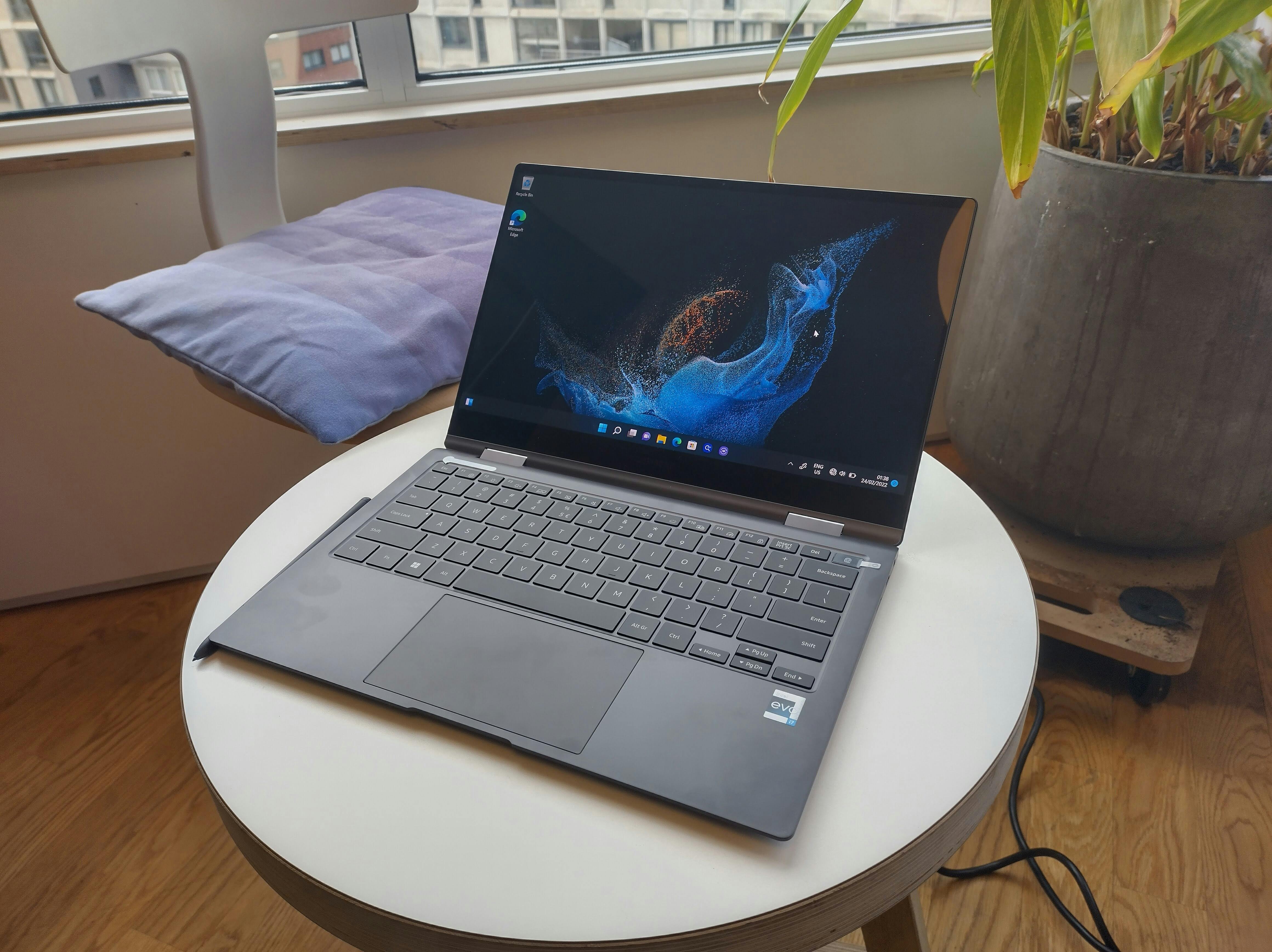Ook de Galaxy Book2 Pro 360 is er in een 13,3- en 15,6inch-uitvoering. De Book2 Pro 360 is een omklapbare laptop met een 360graden-scharnier. De stevigere scharnierconstructie en dikkere schermdeksel zorgen voor een wat hoger gewicht dan de normale Book2 Pro. Het 13,3inch-model weegt 1,04 kilogram terwijl het 15,6inch-model op 1,41 kilogram komt. Samsung had overigens alleen de 13,3inch-uitvoering beschikbaar voor een hands-on. De laptop is gemaakt van aluminium en komt stevig over. In tegenstelling tot de normale Book2 Pro voelt ook de schermdeksel stevig. Samsung had alleen antraciete en witte modellen waarbij eveneens geldt dat de donkere variant gevoelig is voor vingerafdrukken. De bordeauxrode variant kon nog niet getoond worden.