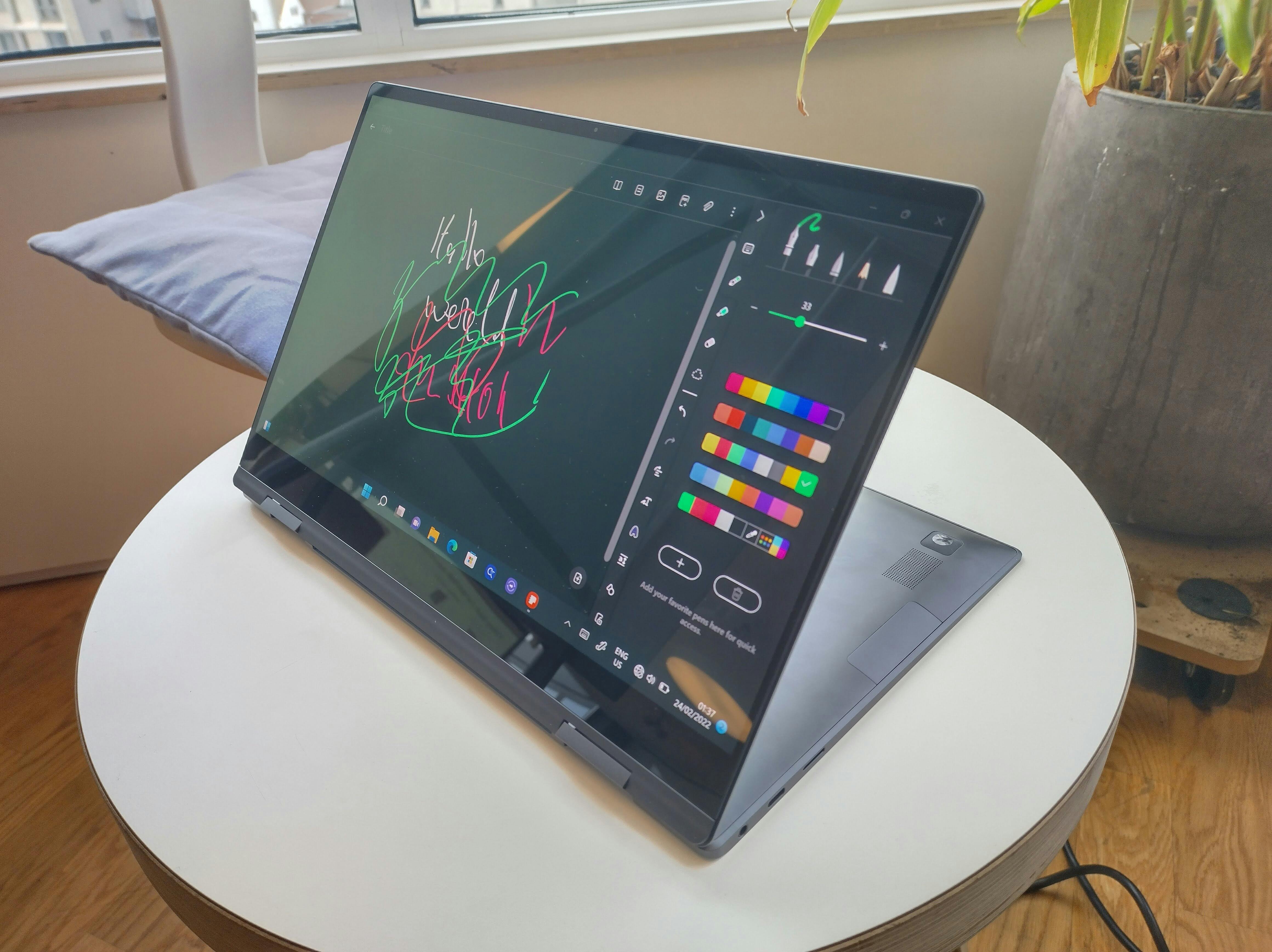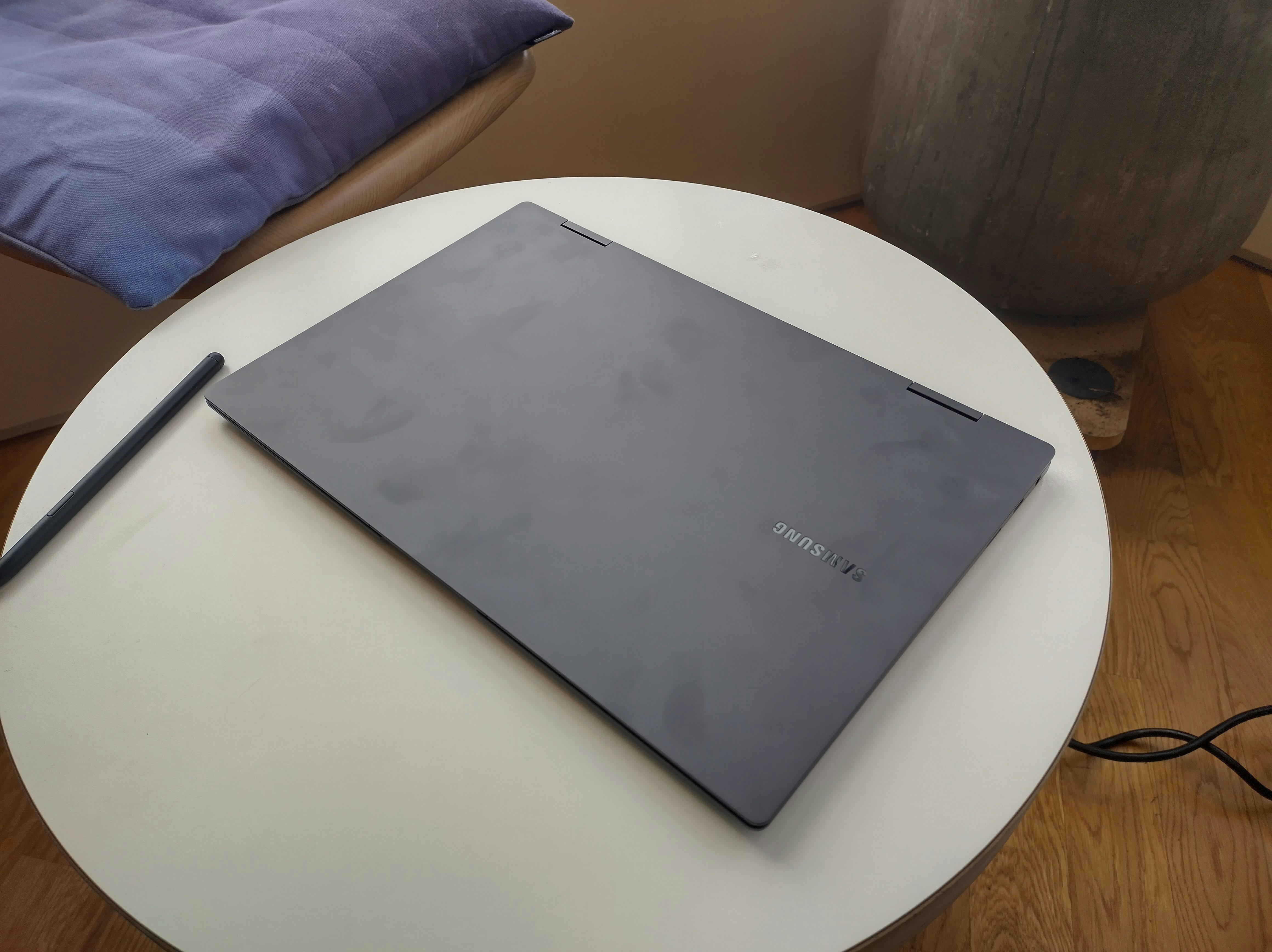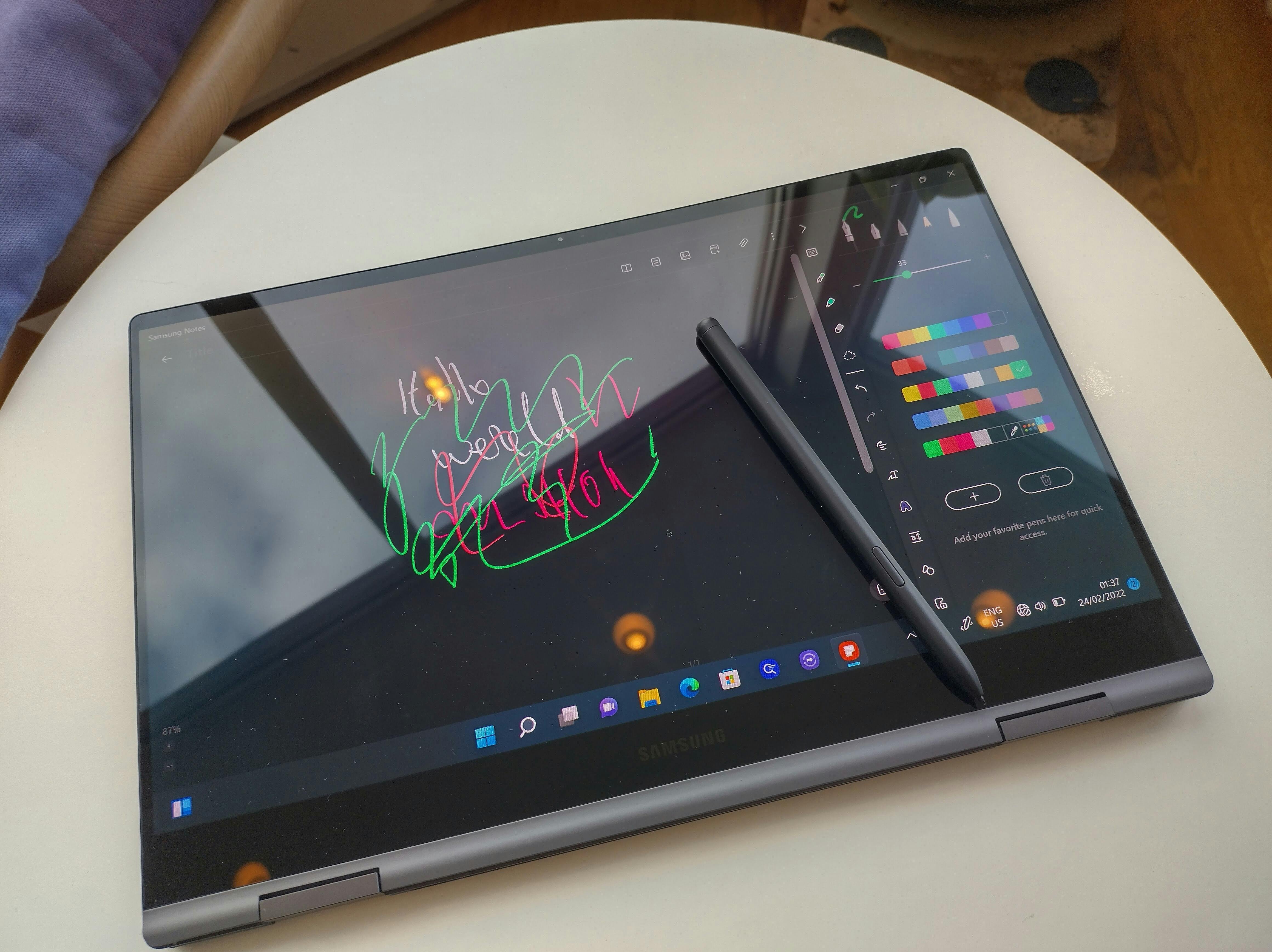 De Galaxy Book2 360 is wat zwaarder dan de normale variant, maar is nog steeds een lichte laptop. Het toetsenbord en touchpad voelen ook bij deze laptop prettig aan. De schermresoluties is hetzelfde als bij de normale Galaxy Book2, maar er wordt een ander Super AMOLED-paneel gebruikt met een hogere helderheid van 400 nits. Ook bij deze laptop zou de maximale helderheid bij HDR hoger liggen en heeft het scherm een DisplayHDR 500-certificering. Ook bij de 360-uitvoering is het scherm net als op de normale Book2 glanzend uitgevoerd, maar hierbij gaat het uiteraard wel om een aanraakscherm. Dat aanraakscherm kan ook met de actieve stylus S pen worden bediend.