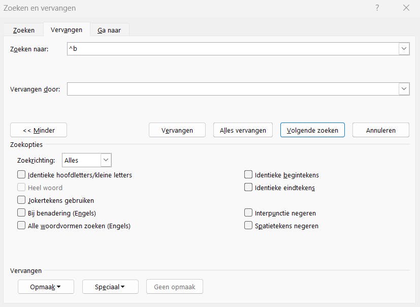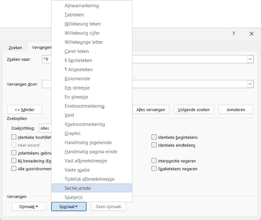 Wil je zeker zijn dat er geen sectie-einden achterblijven, gebruik dan de opdracht Zoeken en vervangen. Druk op Ctrl+H om dit dialoogvenster te openen. Klik vervolgens op Meer en ga naar het veld Zoeken naar. Selecteer onderaan de knop Speciaal en kies Sectie-einde in het keuzemenu. Hierdoor wordt de code ^b automatisch ingevuld in het veld Zoeken naar. Laat het veld Vervangen door leeg als je alle sectie-einden wilt verwijderen. Klik daarna op Alles vervangen om ze in één keer te wissen, of gebruik Volgende zoeken en Vervangen om ze één voor één te verwijderen. Klik op Sluiten als je klaar bent.