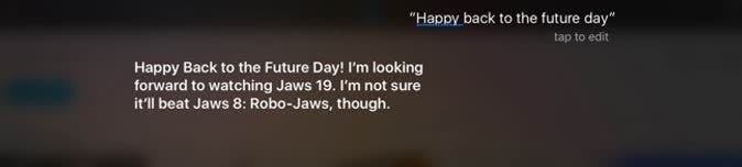 Oké, het is nogal gimmicky, maar we vinden het stiekem best leuk. Wens de Amerikaanse Siri "Happy Back to the Future Day!" en ze zal antwoorden met anekdotes uit de film. Dit is in te stellen via Instellingen > Algemeen > Siri > Taal. Onze favoriete reacties: