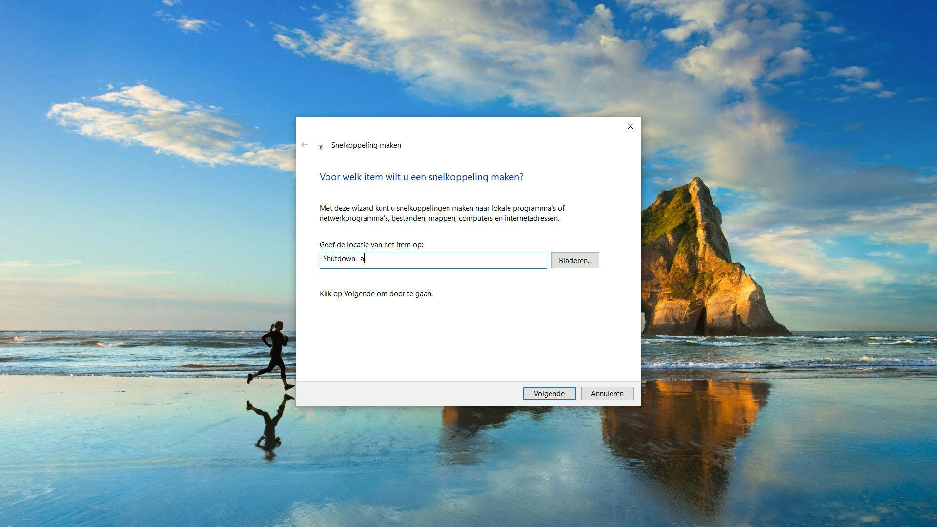 Je kunt daarna ook een snelkoppeling maken voor het annuleren van de timer. Volg de stappen hierboven op en vul in het invulveld de tekst Shutdown -a in. Geef ook deze snelkoppeling een naam en druk wederom op Voltooien.