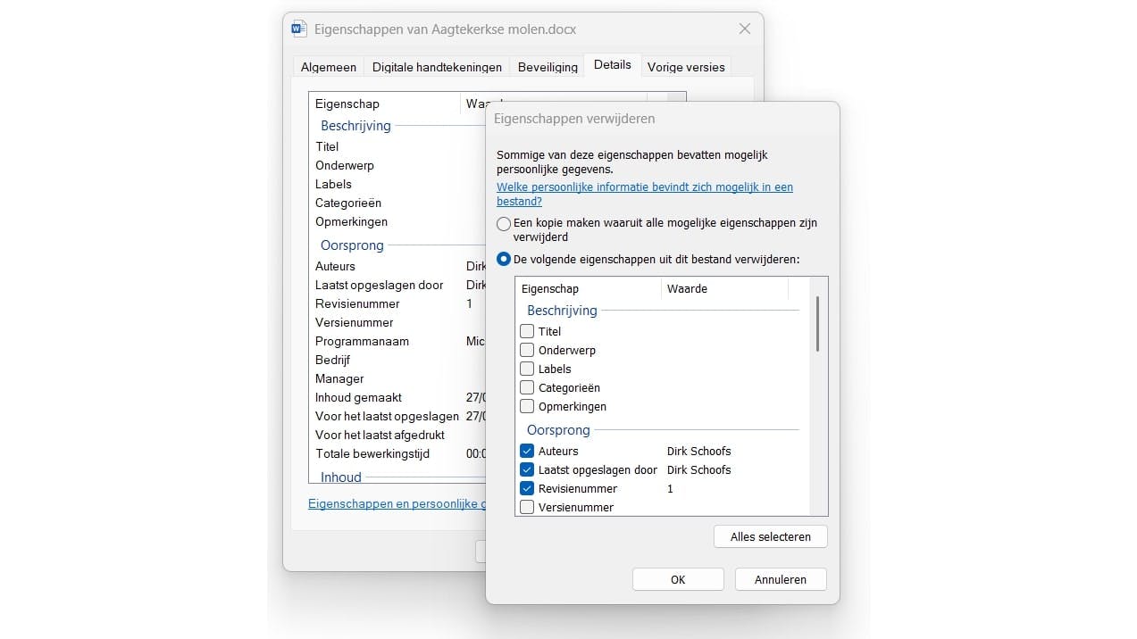 Gelukkig kun je deze metadata in Windows Verkenner eenvoudig verwijderen. Navigeer naar het bestand dat je wilt delen. Klik er met de rechtermuisknop op en kies Eigenschappen. Of gebruik de toetscombinatie Alt+Enter. Ga naar het tabblad Details. Klik onderaan op Eigenschappen en persoonlijke gegevens verwijderen. Hier kun je ook de optie Maak een kopie waarbij alle mogelijke eigenschappen zijn verwijderd selecteren. Bevestig met OK. Hierdoor ontvang je een kopie van het bestand zonder de metadata.