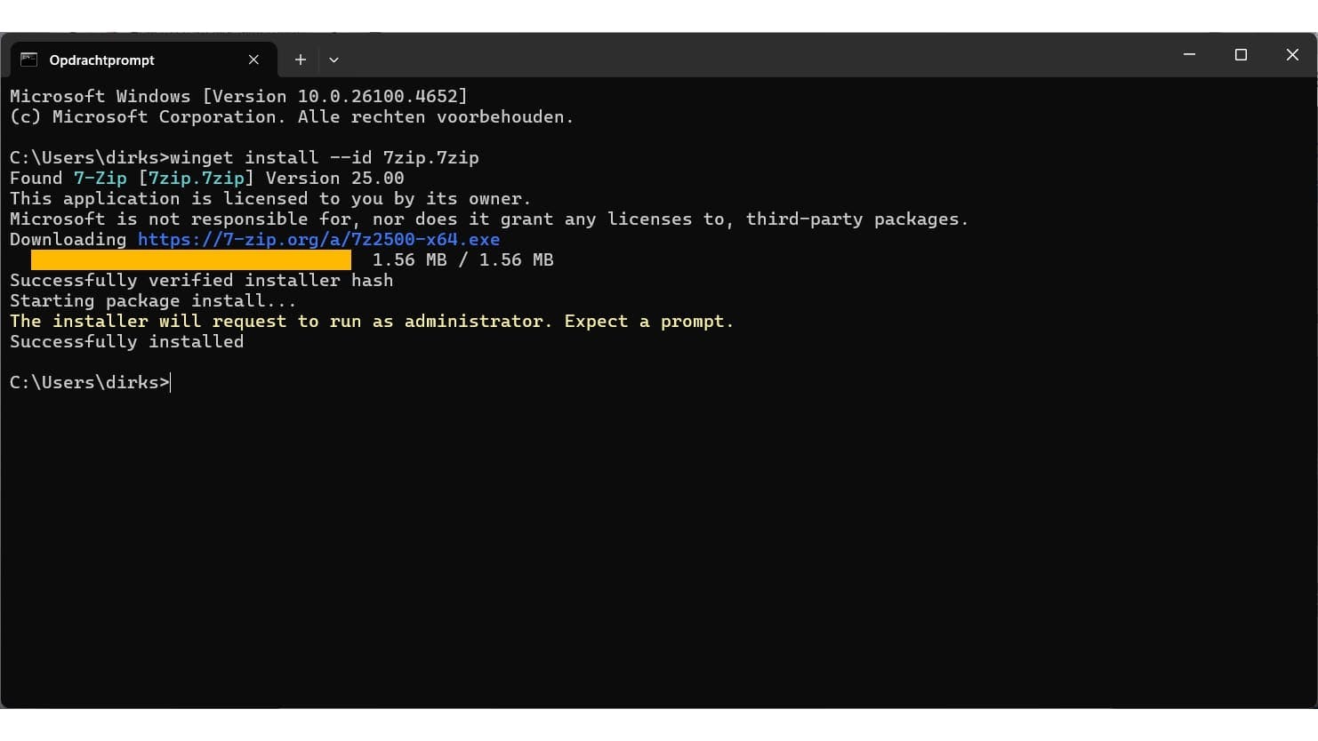 7-Zip installeer je via de Opdrachtprompt: Open het Startmenu en zoek naar Opdrachtprompt. Klik met de rechtermuisknop op het resultaat en kies Als administrator uitvoeren. Typ de volgende opdracht en druk op Enter: winget install --id 7zip.7zip.