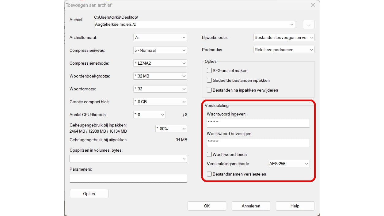 Je kunt ervoor kiezen om het wachtwoord zichtbaar te maken, zodat je zeker weet dat je geen typfouten maakt. Daarnaast kun je ook de bestandsnaam versleutelen. Dat zorgt ervoor dat zelfs de naam van het bestand niet meer herkenbaar is, wat de inhoud extra goed afschermt voor nieuwsgierige ogen. Het resultaat is een versleuteld archiefbestand - een soort digitale container - dat alleen geopend kan worden met het ingestelde wachtwoord.