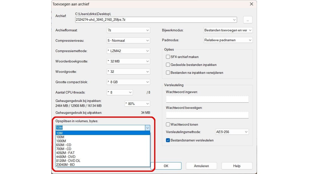 Open opnieuw 7-Zip en voeg het bestand toe dat je op deze manier wilt beveiligen. Stel een encryptiewachtwoord in en bevestig dat. In het veld Opsplitsen in volumes, bytes kies je de gewenste bestandsgrootte per deel. Dit is vooral handig voor grote bestanden. Stel dat het originele bestand 40 MB groot is. Als je 10 MB opgeeft, maakt 7-Zip er automatisch vier gelabelde delen van.