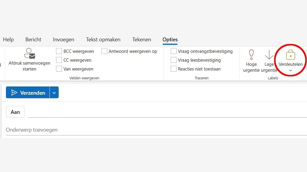 Daarna ga je naar het tabblad Opties bovenaan het Lint. Klik op de knop Versleutelen. Je kunt hier ook kiezen uit verschillende beveiligingsniveaus. Maak je bericht af zoals gewoonlijk en klik op Verzenden. De e-mail wordt nu automatisch versleuteld verstuurd. De inhoud is onderweg beschermd en kan alleen worden geopend door de bedoelde ontvanger.