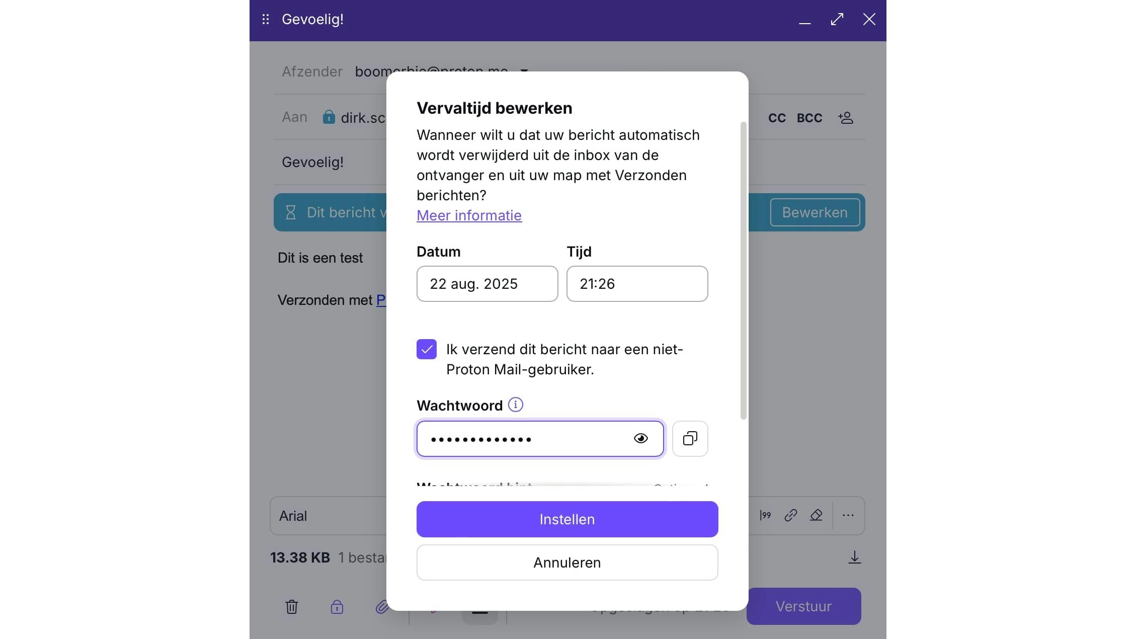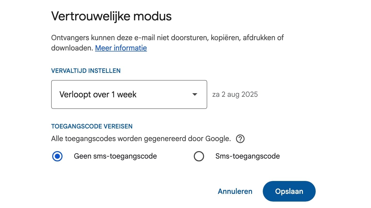 Gebruik je de mobiele app? Tik dan op de drie puntjes rechtsboven en kies daar het slotje. Ontvangers kunnen deze mail vervolgens niet doorsturen, kopiëren, afdrukken of downloaden. Er verschijnt ook een pop-upvenster waarin je de vervaltijd van het bericht instelt. Je kunt kiezen uit: 1 dag, 1 week, 1 maand, 3 maanden of 5 jaar. Na afloop van de gekozen periode verdwijnt het bericht automatisch uit de postbus.
