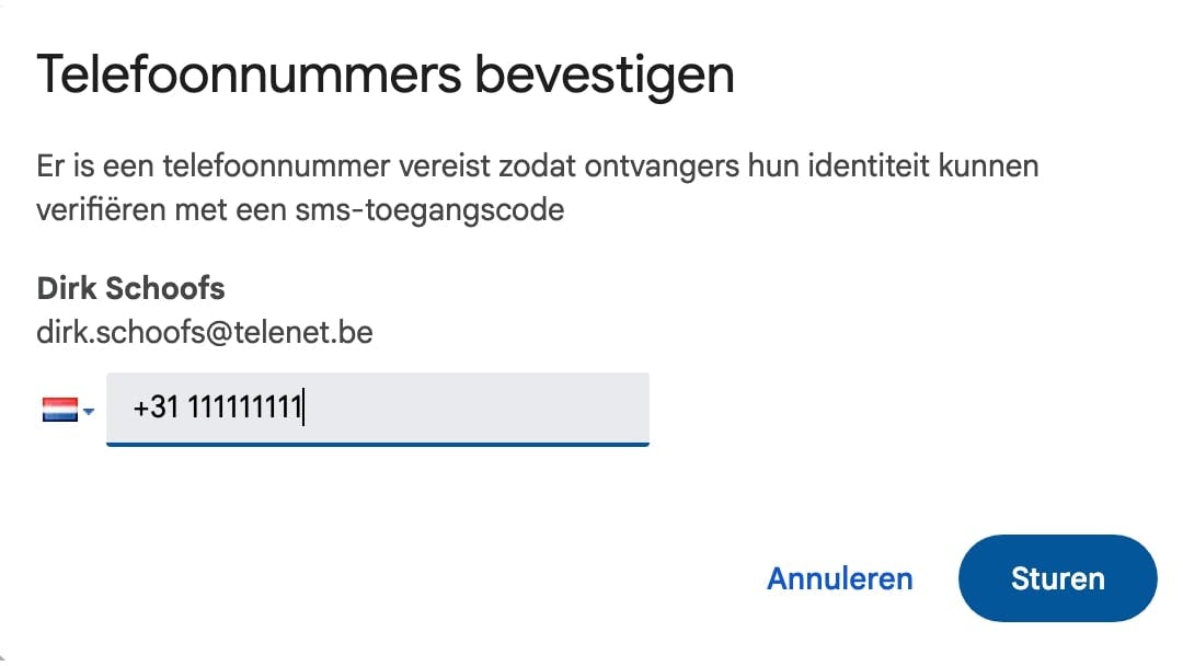Klik op Opslaan en vervolgens op Verzenden. Op dit moment kun je eventueel nog de vervaltijd van het bericht aanpassen. Dan verschijnt er nu een tweede pop-upvenster waarin je het telefoonnummer van de ontvanger moet invoeren. Klik opnieuw op Verzenden. De ontvanger krijgt vervolgens een e-mail met daarin een knop om het vertrouwelijke bericht in de browser te openen. Is sms-verificatie ingeschakeld? Dan ziet de ontvanger ter bevestiging de laatste twee cijfers van zijn of haar gsm-nummer. Na een klik op Send passcode wordt de toegangscode per sms verstuurd.