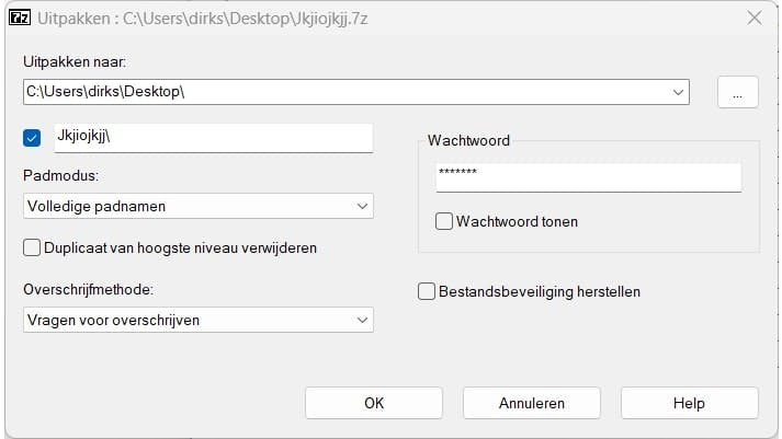 Deze opent het bestand in 7-Zip, selecteert het en klikt op de knop Uitpakken. Daarna vraagt 7-Zip waar het uitgepakte bestand moet worden opgeslagen en voert de ontvanger het juiste wachtwoord in. Stuur het wachtwoord nooit samen met het bestand. Verstuur het wachtwoord via sms, telefoon of een ander chatplatform.