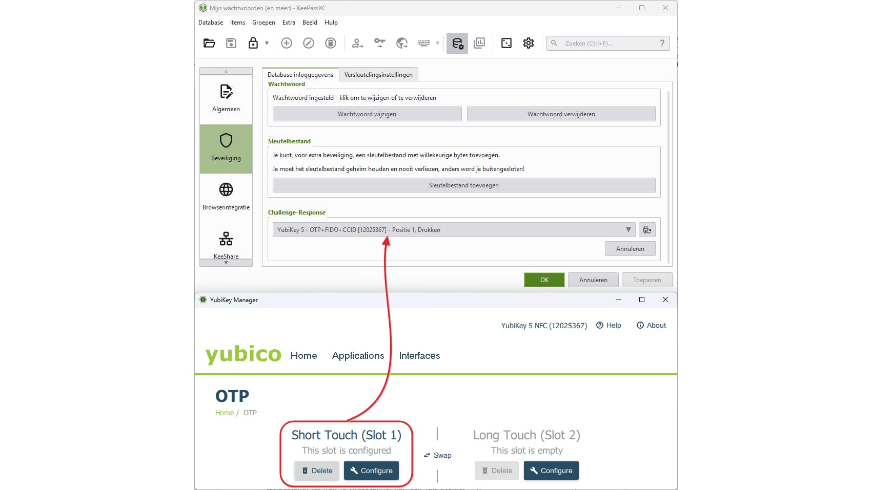 Open vervolgens je database in KeePassXC en ga naar Database / Databasebeveiliging. Kies Aanvullende bescherming toevoegen / Challenge-Response toevoegen. Selecteer het juiste slot van je ingeplugde beveiligingssleutel en bevestig met OK.