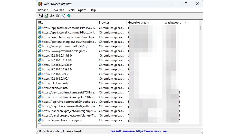 Gebruik je meerdere browsers en zoek je het wachtwoord van een specifieke site, wil je alle wachtwoorden exporteren voor import in een andere browser, of is je systeem gecrasht en wil je de wachtwoorden uit je browserprofielen halen? Dan kan het gratis WebBrowserPassView handig van pas komen (let op: je virusscanner kan een foutpositief geven). Pak het zip-bestand uit met het wachtwoord wbpv28821@ en start de portable app. Je krijgt een overzicht van alle gevonden sites en log-ins. Via Bestand / Geselecteerde items opslaan kun je exporteren naar diverse csv-formaten, zoals voor Chrome, KeePass en Firefox.