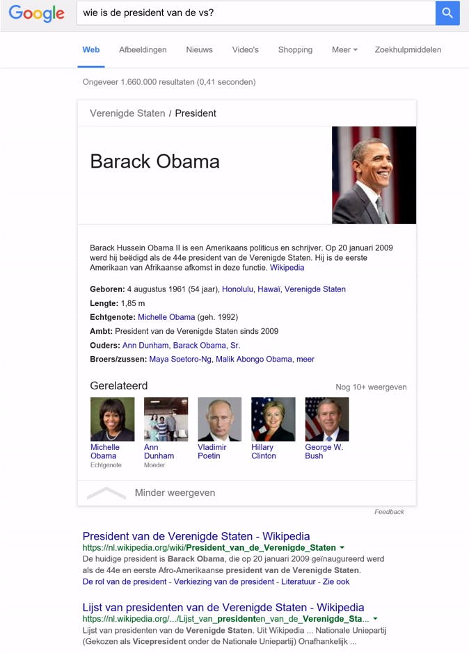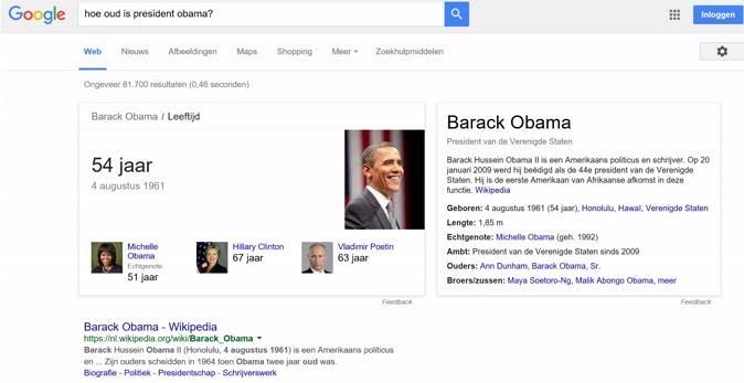 Je kunt Google allerlei vragen stellen, waarna de zoekmachine je een antwoord geeft in plaats van alleen maar een lijst met webpagina's als zoekresultaten.