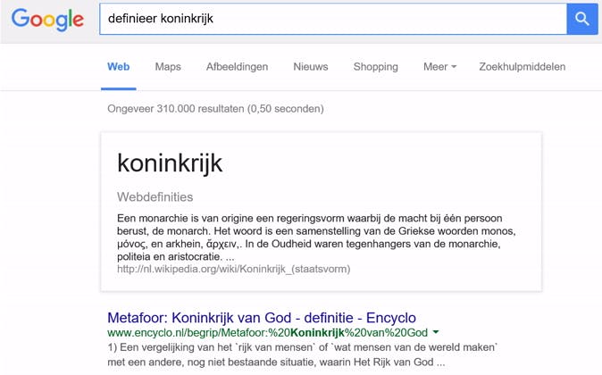 Om de definitie van een woord op te zoeken, kun je natuurlijk naar een online woordenboek gaan en het woord als zoekterm invoeren. Maar je kunt ook direct vanuit Google definities opvragen door definieer gevolgd door het woord te typen.
