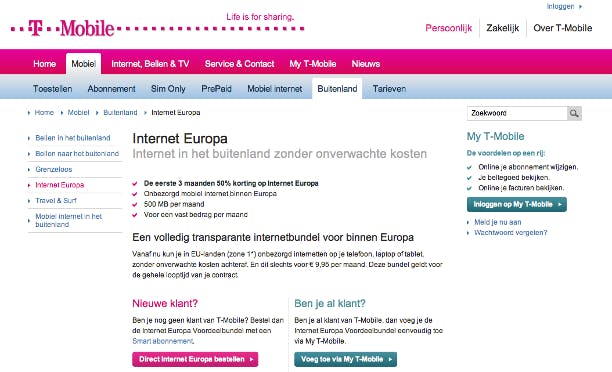 U kunt dan wel goed letten op de instellingen om het dataverkeer in het buitenland te beperken, maar uiteindelijk wilt u uw smartphone wel gewoon gebruiken. Dat is natuurlijk prima mogelijk. Was het jaren geleden nog mogelijk om achteraf opgescheept te zitten met torenhoge rekeningen omdat de smartphone ongemerkt allerlei data binnensleepte in het buitenland, tegenwoordig is er veel meer regelgeving om dit soort praktijken te voorkomen. Zo heeft het Europese Parlement met regelgeving ingestemd die ervoor zorgt dat vanaf de zomer van 2012 in Europa de vaste maximumprijs geldt van 50 eurocent per megabyte. Vanaf 2014 moet dit 20 eurocent worden. Dit klinkt vrij streng, maar als u flink gebruikmaakt van Spotify en daarbij een halve gigabyte aan dataverkeer genereert, betaalt u met 50 cent per megabyte toch nog zo'n 250 euro. Veel handiger is het om bij uw provider een extra service in te stellen om zo zorgeloos te internetten in het buitenland. Zo biedt T-Mobile een Internet Europa-bundel aan die voor 10 euro per maand 500 MB aan internetdataverkeer toestaat. Komt u boven deze limiet, dan wordt alleen de snelheid vertraagd. Gaat u maar één keer op vakantie, dan kunt u ook voor de Travel & Surf-pas kiezen, die een week lang onbeperkt internetten voor 14,95 euro biedt.