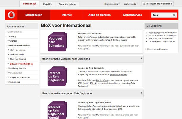 Ook klanten van KPN kunnen voorzieningen treffen om een hoge rekening wegens bezoek aan het buitenland te voorkomen. Met de Internetbundel EU kunt u voor 10 euro per maand zo'n 100 MB aan data binnenhalen binnen Europa. Overschrijdt u die limiet, dan ontvangt u een sms. U kunt daarna nog gewoon doorgaan met internetdata 'gebruiken', alleen betaalt u wel de gebruikelijke hoge kosten per megabyte. Ook Vodafone heeft speciale voorzieningen om de reiziger voordelig te laten internetten. Deze diensten zijn verpakt in de zogenaamde Blox, die Vodafone-klanten zelf kunnen in- en uitschakelen. Met de Internet op Reis Dagbundel kunt u voor 2 euro per dag tot 35 megabyte downloaden in de zogenaamde Passport-landen, waarvan de meeste zich in Europa bevinden. Wilt u ook in andere landen zoals de Verenigde Staten gebruikmaken van een soortgelijke dienst, dan komt de Reis Dagbundel Wereld van pas, die 4 megabyte dataverkeer toestaat voor 5 euro per dag. Bij de telecomproviders geldt dat de internetdiensten in het buitenland ook onderdeel kunnen zijn van een mobiel abonnement, maar in de meeste gevallen kunt u ze beter los inschakelen als u er alleen op vakantie gebruik van wilt maken.
