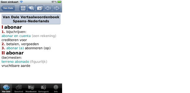 De smartphone is een handig hulpmiddel op reis. Zo zijn er verschillende digitale woordenboeken verkrijgbaar voor de iPhone, zoals de Van Dale Pocketwoordenboeken. Op het moment van schrijven zijn deze verkrijgbaar voor 10 euro per stuk. Wel moet u er rekening mee houden dat dit een vrij beknopte versie is van het woordenboek en dat u bijvoorbeeld op reis in Frankrijk niet letterlijk alle woorden zult vinden. Wel handig is dat u in de zoekfunctie een vraagteken kunt gebruiken als u de spelling niet precies weet, dat u in beide richtingen kunt vertalen en een zoekgeschiedenis van de laatste 100 woorden wordt bijgehouden. Bovendien kunt u deze app offline gebruiken, ook al is hij maar 64 megabyte groot. De woordenboeken van Prisma bieden in plaats van de 65.000 woorden van Van Dale zelfs 70.000 woorden en tienduizenden voorbeeldzinnen. De apps, die onder andere verkrijgbaar zijn in het Spaans, Duits en Frans, kosten 7 euro en zijn ook op de iPad te gebruiken.