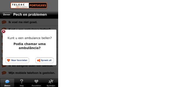 iPhone-apps van TeleacTalen. Deze apps, verkrijgbaar in allerlei talen, zoals Duits, Frans, Italiaans en Portugees, bevatten meer dan tweehonderd gesproken zinnen en woorden in categorieën als Pech en problemen, Reizen en Hotel. Tik bijvoorbeeld de zin "Heeft u een kamer vrij?" aan en de app spreekt de zin in de taal van de app uit, zodat u hem niet zelf hoeft uit te spreken. U kunt ook een lijst met favorieten aanmaken om snel de juiste zin te vinden. Voor Android zijn er de 100%-taalgidsen, zoals 100% Engels, Duits, Frans, Spaan, Italiaans en Portugees.