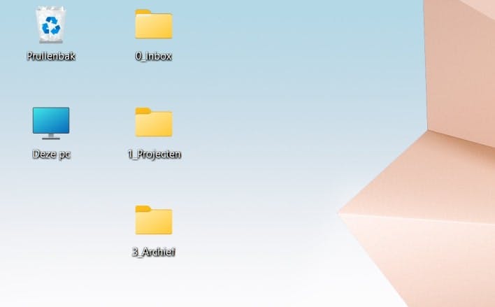 De kern van een productief bureaublad is een logische groepering. Maak daarom eens drie hoofdmappen die je werkstroom dekken. Je hoeft dan alleen nog maar met de rechtermuisknop te klikken op het bureaublad en te kiezen voor Nieuw / Map. Noem ze bijvoorbeeld 0_Inbox, 1_Projecten en 9_Archief. De cijfers zorgen dat ze alfabetisch bovenaan blijven.