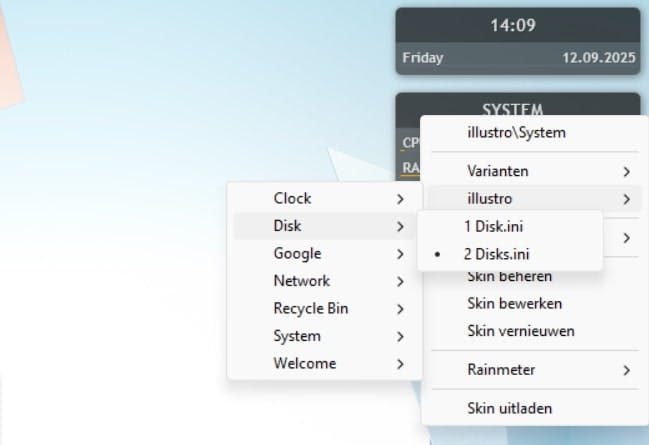 Wil je live-informatie zonder vensterdrukte, gebruik dan Rainmeter. Start het programma en open de beheerder door met rechts te klikken op het Rainmeter-pictogram in het systeemvak rechtsonder. Klik vervolgens op Beheren. Laad een basisskin, bijvoorbeeld illustro, door in het tabblad Skins de gewenste module te selecteren en op Laden te klikken.