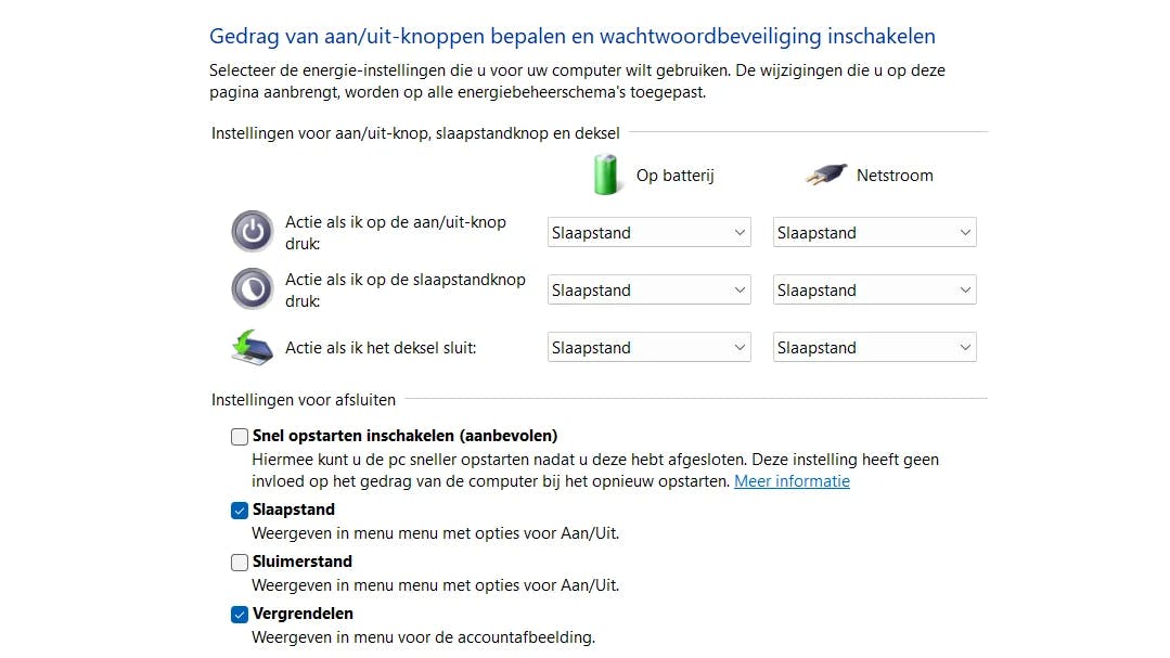 Kies in de linkerkolom Het gedrag van de aan/uit-knoppen bepalen. Wanneer je dit venster voor de eerste keer opent dan zal het selectievakje grijs staan, waardoor je niets kunt wijzigen. In dat geval moet je eerst klikken op de optie Instellingen wijzigen die momenteel niet beschikbaar zijn.