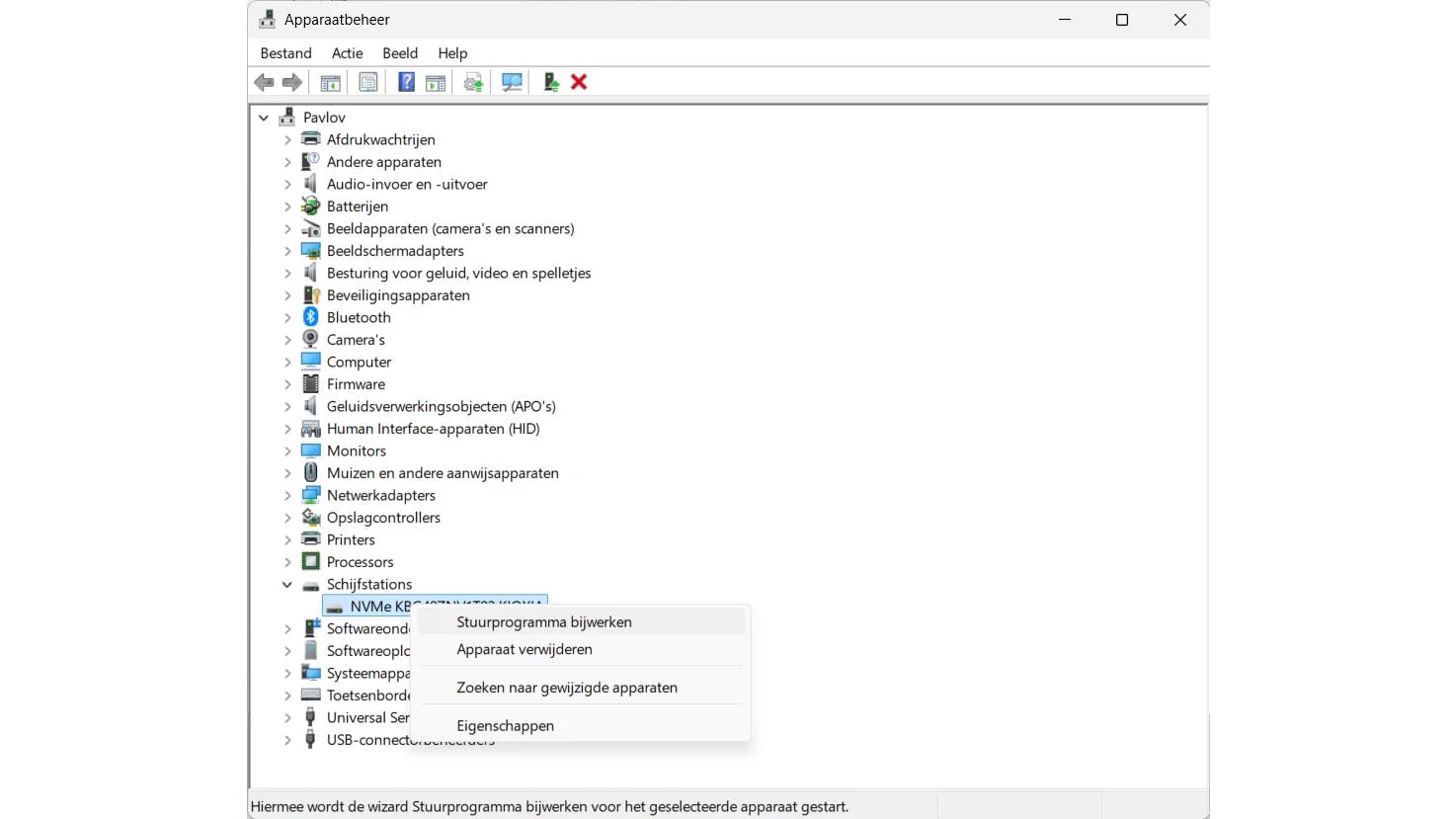 Een handig hulpmiddel is CrystalDiskInfo. Deze gratis tool toont gedetailleerde informatie over de schijf, waaronder de firmwareversie. Zo kun je snel zien of er een update beschikbaar is. Heeft Windows ondertussen nieuwe stuurprogramma's gedownload maar nog niet geïnstalleerd, dan kun je die toepassen via Apparaatbeheer. Klik met de rechtermuisknop op het Startmenu en kies Apparaatbeheer. Vouw Schijfstations uit. Klik met de rechtermuisknop op je SSD en kies Stuurprogramma bijwerken.