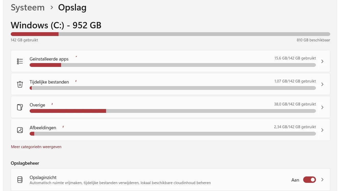Een SSD bestaat uit geheugencellen waarin data wordt opgeslagen. Die cellen slijten telkens wanneer ernaar wordt geschreven. Zonder bescherming zouden sommige cellen, zoals diegene waarop vaak systeemdata wordt geschreven, veel sneller verslijten dan andere. Daarom zit diep in de ingebouwde controllerchip van de SSD, een ingebouwde functie die zorgt dat alle geheugencellen evenwichtig worden aangesproken, zodat de schijf gelijkmatig slijt en betrouwbaar blijft. Wear leveling verdeelt de schrijfbewerkingen gelijkmatig over alle cellen, maar deze technologie heeft ruimte nodig om goed te kunnen werken. Als de schijf bijna vol is, kan de controller minder efficiënt herschikken en dan slijten bepaalde cellen sneller. Probeer slechts 75% van de SSD te gebruiken voor opslag en laat de overige 25% vrij om de schijf snel te houden. Dit zal de duurzaamheid op de lange termijn ook vergroten. Er zijn verschillende manieren om opslagruimte vrij te maken in Windows 11. Ga naar Instellingen / Systeem / Opslag en schakel Opslaginzicht in. Of gebruik Schijfopruiming om tijdelijke en ongewenste bestanden te verwijderen.