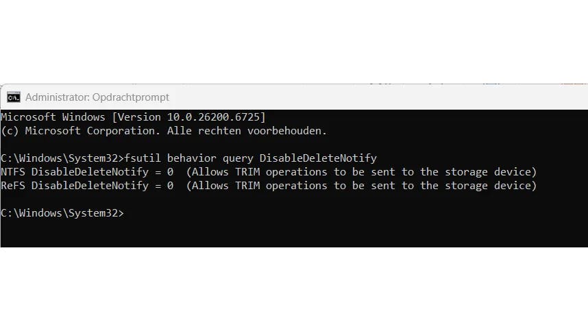 TRIM vertelt de SSD welke gegevens echt verwijderd zijn, zodat de schijf intern kan opruimen en die ruimte klaar kan maken voor nieuwe schrijfbewerkingen. In Windows 11 is TRIM standaard ingeschakeld, maar het is een kleine moeite om dit even te controleren. Open de Opdrachtprompt als administrator. Dan typ je fsutil behavior query DisableDeleteNotify. Krijg je als resultaat DisableDeleteNotify = 0 dan is TRIM ingeschakeld. Zie je daarentegen DisableDeleteNotify = 1 dan is TRIM uitgeschakeld. Om TRIM in dat geval te activeren, typ je fsutil behavior set DisableDeleteNotify 0 en druk je op Enter.