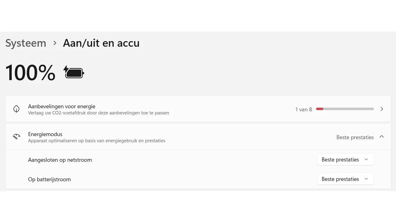Wanneer je computer een tijdje inactief is geweest, kun je vooral bij een laptop merken dat hij in het begin traag reageert. Dat komt doordat Windows standaard de energie-instellingen aanpast om stroom te besparen. Door de energiemodus op Beste prestaties te zetten in plaats van op Beste energie-efficiëntie, kun je die vertraging elimineren en de snelheid merkbaar verhogen. Druk op Win+I om Instellingen te openen. Ga dan naar Systeem / Aan/uit en accu. Vouw het menu Energiemodus open en kies bij zowel Aangesloten op netstroom als Op batterijstroom de optie Beste prestaties.