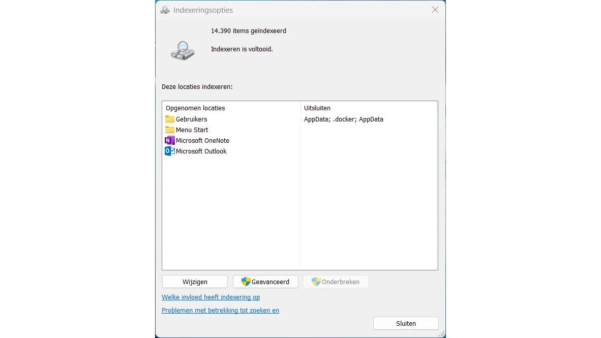 Windows indexeert standaard de bestanden om sneller te kunnen zoeken. Daarvoor maakt het systeem een catalogus van alle bestanden op de schijf. Bij oudere, trage harde schijven had dit een merkbare invloed op de prestaties, omdat de schijf voortdurend kleine stukjes data moest lezen en schrijven. Op een SSD liggen de zaken anders. De toegangstijden zijn extreem kort en de kleine schrijfbewerkingen van de indexering zijn verwaarloosbaar op vlak van snelheid en levensduur. Alleen in uitzonderlijke gevallen kan het zinvol zijn de indexering uit te schakelen, bijvoorbeeld op een lichte pc met weinig RAM of op oudere hardware, of als je zelden zoekt via Verkenner of het Startmenu. In alle andere gevallen laat je de functie beter aan, of beperk je de indexering tot specifieke mappen, zoals Documenten. Op deze manier beperk je de indexering. Druk op Win+S en typ Indexeringsopties. Klik op het resultaat Indexeringsopties. Selecteer Wijzigen om te zien welke locaties worden geïndexeerd. Haal de vinkjes weg bij overbodige mappen en laat alleen Documenten (of andere gewenste mappen) geselecteerd.