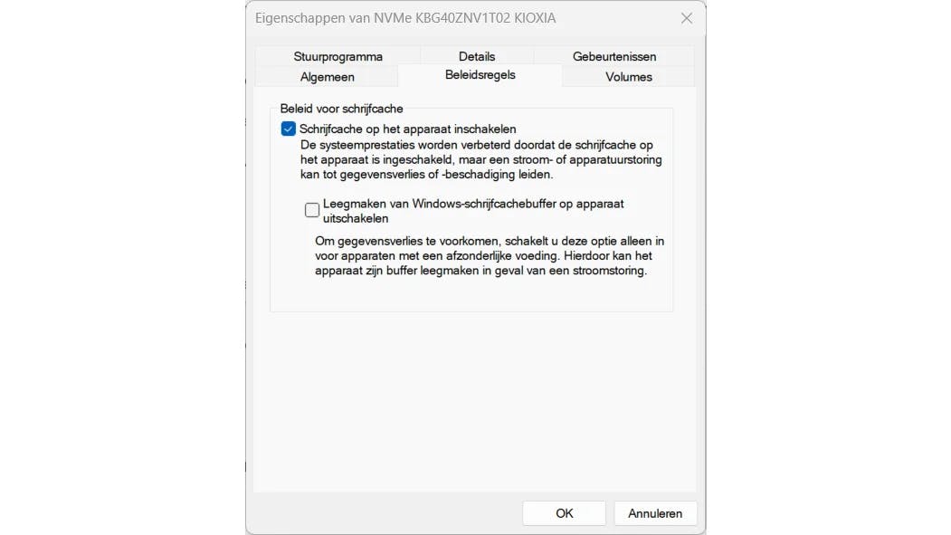 Open het tabblad Beleidsregels. Zorg dat de optie Schrijfcache op het apparaat inschakelen is aangevinkt. Dit bevordert zowel de prestaties als de duurzaamheid. Laat de optie Leegmaken van Windows-schrijfcachebuffer op apparaat uitschakelen uitgeschakeld, tenzij je zeker weet dat je computer beschermd is tegen stroomuitval (bijvoorbeeld met een noodstroomvoeding).