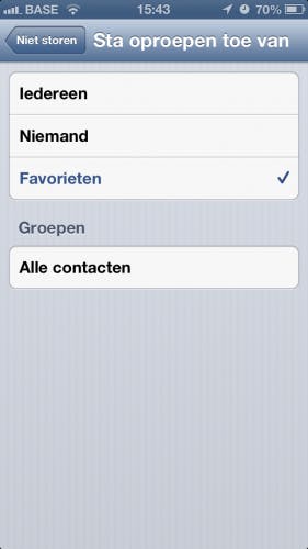 Je beslist zelf wie jou ‘s nachts mag contacteren. Wil je geen enkel gesprek missen, laat dan Iedereen staan bij Sta oproepen toe van. Kies Niemand als niemand tijdens je nachtelijke activiteiten mag storen. Een gulden middenweg kan ook. Door Favorieten te kiezen, komen enkel inkomende gesprekken van jouw favoriete contactpersonen door. Om contactpersonen als favoriet te bestempelen open je de standaard-app Contacten, selecteer je een contactpersoon en tik je op Zet in favorieten. Indien je gebruik maakt van contactgroepen, kan je ook nog aangeven welke groepen contactpersonen je ‘s nacht mogen storen. Geef bijvoorbeeld toestemming aan familieleden of goede vrienden om jou in het holst van de nacht wakker te bellen maar blokkeer collega’s of klanten.