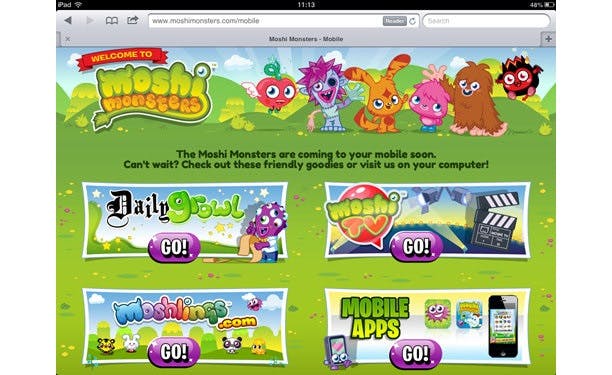 Boven: Moshi Monsters in de iSwifter browser app voor de iPad.