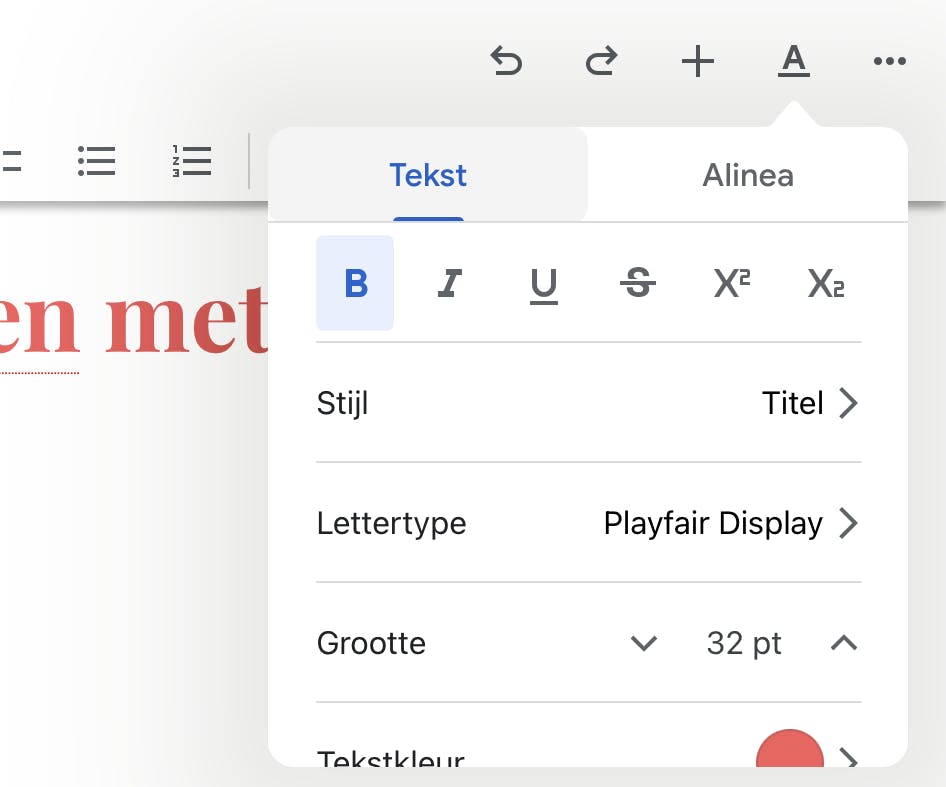 maken, klik of tik je op de plus rechtsonder in beeld. Kies uit een kaal nieuw document of gebruik een van de Templates (sjablonen) voor een snelle start. Kies je een template, dan zie je eerst een voorbeeld; om daadwerkelijk te gaan bewerken tik je op het pennetje rechtsonder in beeld. Via het overzichtelijke rijtje knoppen in de knoppenbalk heb je snel toegang tot de welbekende opmaakhulpmiddelen. Finetunen kan door op de knop A te drukken. Je krijgt dan uitgebreide mogelijkheden voor tekst- en alinea-opmaak.