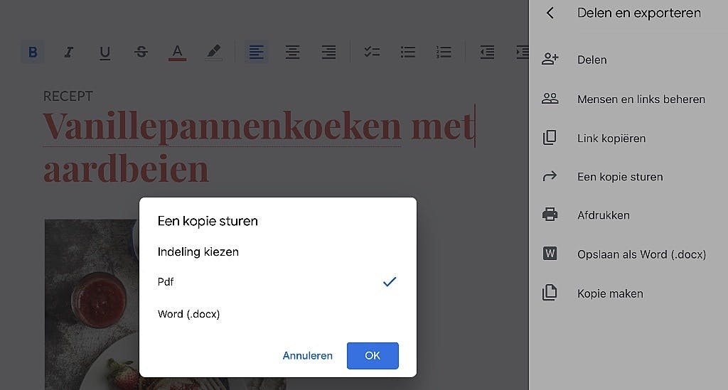 Via de knop met de drie puntjes bereik je nog weer meer mogelijkheden. Gebruik de schakelaar achter Afdrukopmaak om over te schakelen naar een bewerkingsmodus waarbij je document er precies zo uit ziet als het er straks geprint of als PDF ook uitziet. Verder is bijvoorbeeld de optie Delen en exporteren van belang. Hieronder kun je niet alleen exporteren naar het standaard Microsoft Word-bestandformaat maar – handiger – ook naar ’t universele PDF. Dat laatste doe je via de optie Een kopie sturen. Kies vervolgens als bestandsformaat Pdf, waarna je kunt delen naar bijvoorbeeld je mail-app of een PDF-reader.