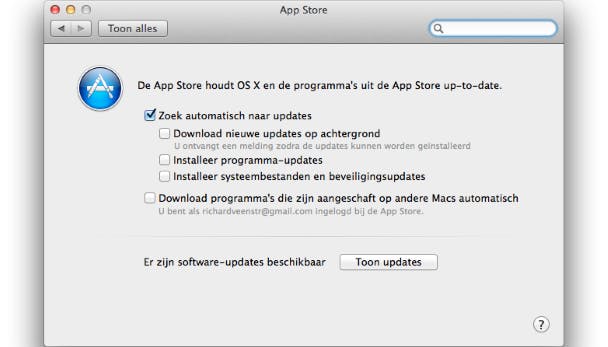 Of je de laatste versie draait, kun je zien door linksboven op het Apple-logo te klikken en te kiezen voor Over deze Mac. Achter Versie zie je welke versie je hebt geïnstalleerd. Klik op Software-update, de App Store wordt geopend en je kunt zien of er OS X-updates beschikbaar zijn. Bij een beveiligingsupdate worden nooit instellingen en documenten van je schijf gewist, dit kan wel gebeuren als je van bijvoorbeeld OS X 10.8 naar OS X 10.9 gaat. In het laatste geval wordt het hele besturingssysteem geüpdatet en kun je ervoor kiezen je hele harde schijf te wissen. Zorg dat je bij zo'n grote update dus goed oplet en een back-up van je gegevens hebt. Om je Mac goed beveiligd te houden, zorg je dat je bij Systeemvoorkeuren / App Store de optie Zoek automatisch naar updates geselecteerd is. Afhankelijk van je voorkeur kun je kiezen om de vakjes eronder ook aan te vinken. Selecteer je de laatste van de drie sub-opties, dan worden beveiligingsupdates automatisch gedownload en geïnstalleerd.