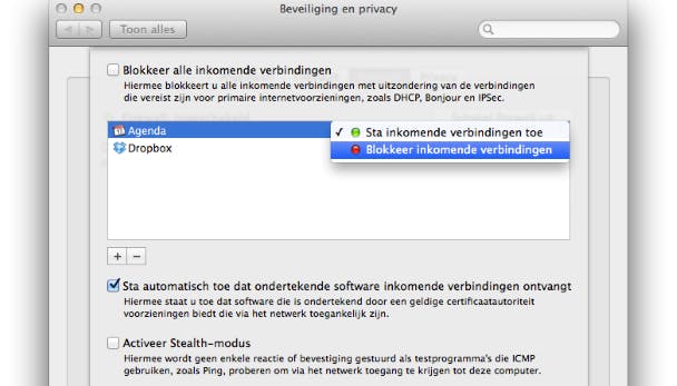 Maximale veiligheid creëer je door een vinkje voor Blokkeer alle inkomende verbindingen te zetten, maar dit kan betekenen dat functies als printer- en bestandsdeling niet meer goed werken. Je kunt per programma bepalen of het met de buitenwereld mag verbinden, klik daarvoor op het plusje en selecteer een programma. Klik op Sta inkomende verbindingen toe en selecteer eventueel Blokkeer inkomende verbindingen. Sluit af door op OK te klikken. Als je de optie Activeer Stealth-modus activeert, is je Mac zelfs niet door andere computers op hetzelfde netwerk te ontdekken.