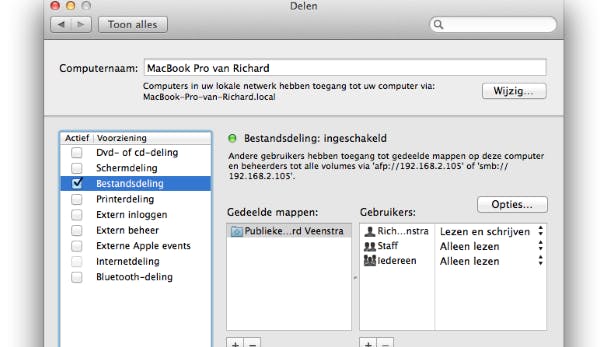 Onder Printers moet je ook nog even de juiste printer selecteren en onder Gebruikers geef je aan wie er gebruik mogen maken van de printer. Met het plusje creëer je een nieuwe gebruikersgroep met andere rechten. Bestanden delen via het netwerk is handig, maar zorg er wel voor dat je de juiste instellingen hebt ingesteld. Bij Bestandsdeling vind je onder Gedeelde mappen een overzicht van mappen op je harde schijf die worden gedeeld met het netwerk. Denk erom dat alle bestanden in deze mappen zijn in te zien door andere gebruikers, wanneer dit onder Gebruikers zo is ingesteld. Je publieke map vind je in de Finder door op Ga / Thuismap / Publiek te klikken.