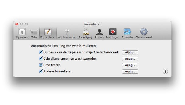 Wil je controle over hoe Safari omgaat met plug-ins zoals Flash en QuickTime, klik dan op Beheer website-instellingen. Je kunt per pagina instellen of deze gebruik mag maken van een bepaalde plug-in. Wil je niet dat je surfgeschiedenis anoniem wordt doorgestuurd naar reclamebureaus, vink dan de optie Vraag websites me niet te volgen aan bij Safari / Voorkeuren / Privacy. Standaard blokkeert Safari alle cookies van derden en adverteerders. Wil je dat Safari helemaal geen cookies toestaat, selecteer dan achter Blokkeer cookies en andere websitegegevens de optie Altijd. Weet wel dat sommige websites hierdoor niet goed kunnen functioneren. Onder het tabblad Formulieren geef je aan of Safari informatie automatisch moet opslaan. Het is natuurlijk het veiligste om Safari bijvoorbeeld geen creditcardinformatie te laten opslaan, maar dit betekent wel dat je bij elke aankoop je creditcardgegevens opnieuw moet invullen.