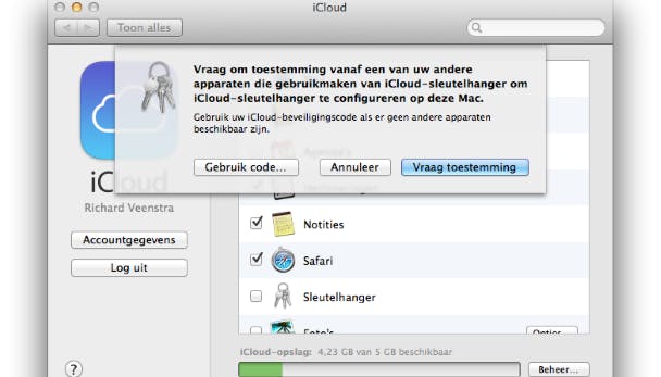Je kunt je sleutelhanger delen met al je andere Apple-apparaten met behulp van iCloud. Ga naar Systeemvoorkeuren / iCloud en vink de optie Sleutelhanger aan, geef eventueel je iCloud-wachtwoord op. OS X wil toestemming krijgen van één van je andere Apple-apparaten die op hetzelfde iCloud-account zijn aangemeld. Klik op Vraag toestemming als je de iCloud-sleutelhanger al eens eerder hebt gebruikt. Configureer je het voor de eerste keer, kies dan voor Gebruik code. Vul de code in die je bij de installatie van OS X hebt ingevuld en bevestig de code in het volgende scherm. Als je je telefoonnummer aan je Apple ID hebt gekoppeld, gaat dit allemaal automatisch. Op je iPhone of iPad stel je de synchronisatie in bij Instellingen / iCloud. De vraag of je Mac de iCloud-sleutelhanger mag gebruiken, bevestig je met Sta toe. Apple beveiligt al je wachtwoorden, maar besef wel dat je met deze optie al je gevoelige informatie naar de servers van Apple stuurt. Gezien de recente NSA-activiteiten weet je niet wie er toch stiekem toegang tot deze gegevens heeft.