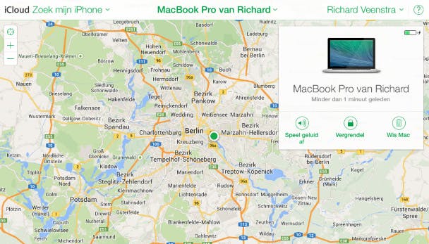 Als je je Mac kwijt bent, ga je naar www.icloud.com en log je in met je iCloud-gegevens. Klik op Zoek mijn iPhone. Dit is een beetje verwarrend, de dienst heet officieel Zoek mijn iPhone, maar je kunt er al je Apple-producten mee traceren. Bovenin selecteer je je Mac door op Alle apparaten en vervolgens op de naam van je Mac te klikken. Aan de rechterkant vind je een paar opties, met de functie Vergrendel zet je de Mac op afstand op slot met een code. Alleen als je de code weet, kun je de Mac ontgrendelen.