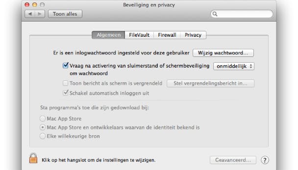 Vergeet vooral ook niet om je Mac te beveiligen met een wachtwoord. Dit doe je door bij Systeemvoorkeuren / Gebruikers en groepen je eigen naam te selecteren en aan de rechterkant je wachtwoord in te stellen. Het is ook aan te raden om je Mac niet automatisch te laten inloggen op één van de accounts. Klik op Inlogopties en selecteer achter Automatisch inloggen de optie Uit. Zorg er verder voor dat je een wachtwoord moet invoeren als je de Mac uit de schermbeveiliging wilt halen. Dit doe je door bij Systeemvoorkeuren / Beveiliging en privacy op het tabblad Algemeen te klikken en een vinkje voor Vraag na activering van sluimerstand of schermbeveiliging om wachtwoord te zetten, kies hier voor de optie onmiddellijk.