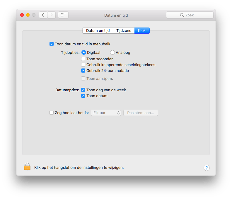 In macOS Sierra is het mogelijk om de weergave van de klok in de menubalk aan te passen. Ga naar Systeemvoorkeuren > Datum en tijd en open het tabblad Klok. Hier moet je zorgen dat Toon datum en tijd in menubalk is aangevinkt. Kies vervolgens onder Tijdopties of de klok digitaal of analoog moet worden weergegeven.