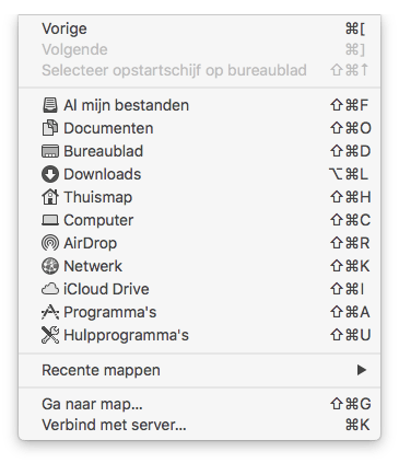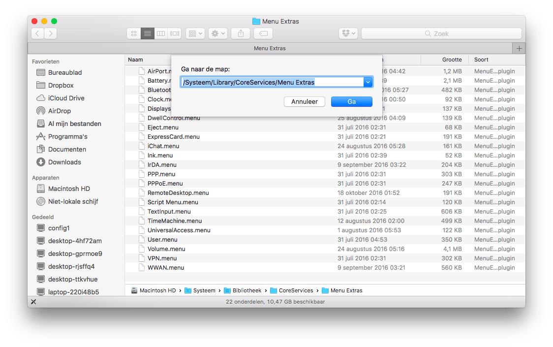 Er zijn echter andere instellingen die je aan de menubalk kunt koppelen die niet in de Systeemvoorkeuren worden weergegeven. Je kunt deze raadplegen door in de Finder in de menubalk op Ga te klikken en Ga naar map… te kiezen. Vul het pad dat hieronder vermeld staat in, en klik daarna op Ga.
