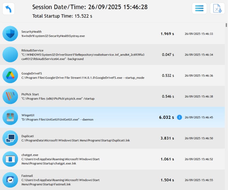 Daarvoor gebruik je BootRacer, dat ook per app de opstarttijd kan vastleggen. Start BootRacer, ga naar Options, open het tabblad Startup Control, klik op Enable Control en vink Measure program’s startup time en Log history of started apps aan. Bevestig met Save. Na een nieuwe Windows-opstart klik je in BootRacer op History en kies je History of Executed Startup Programs, voor een exacte opstarttijd van elke app, in chronologische volgorde.